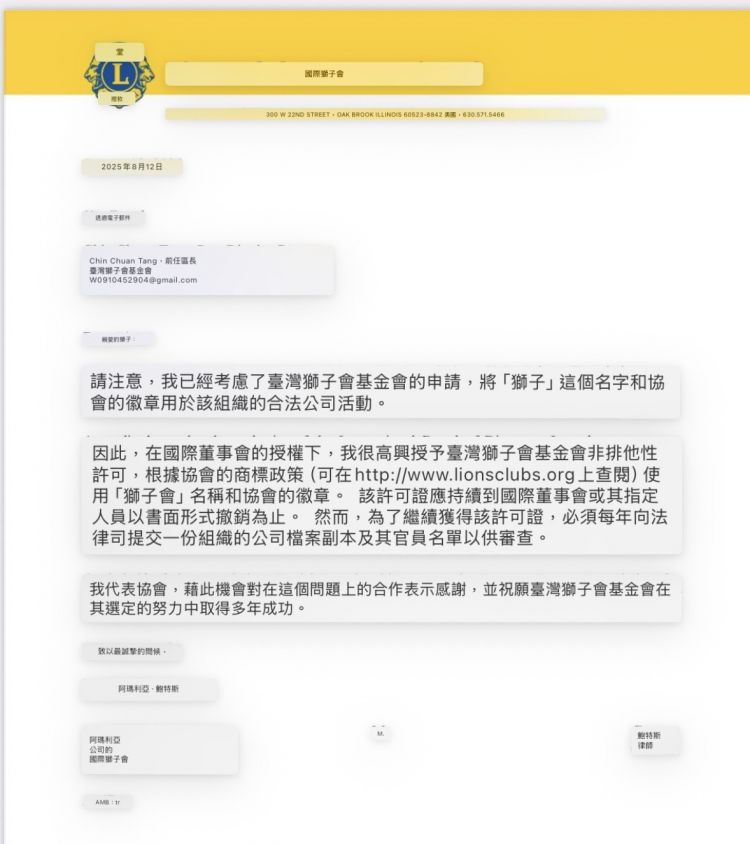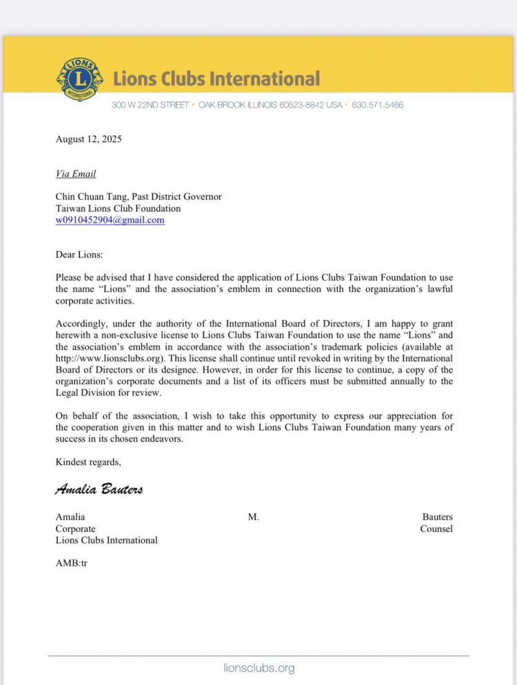 財團法人台灣獅子會基金會 (LCTF)於2025年8月12日正式接獲國際獅子會總會的來函,肯定了我們作為獅子會組織的一部分,並批准我們以獅子會名義進行募款活動。